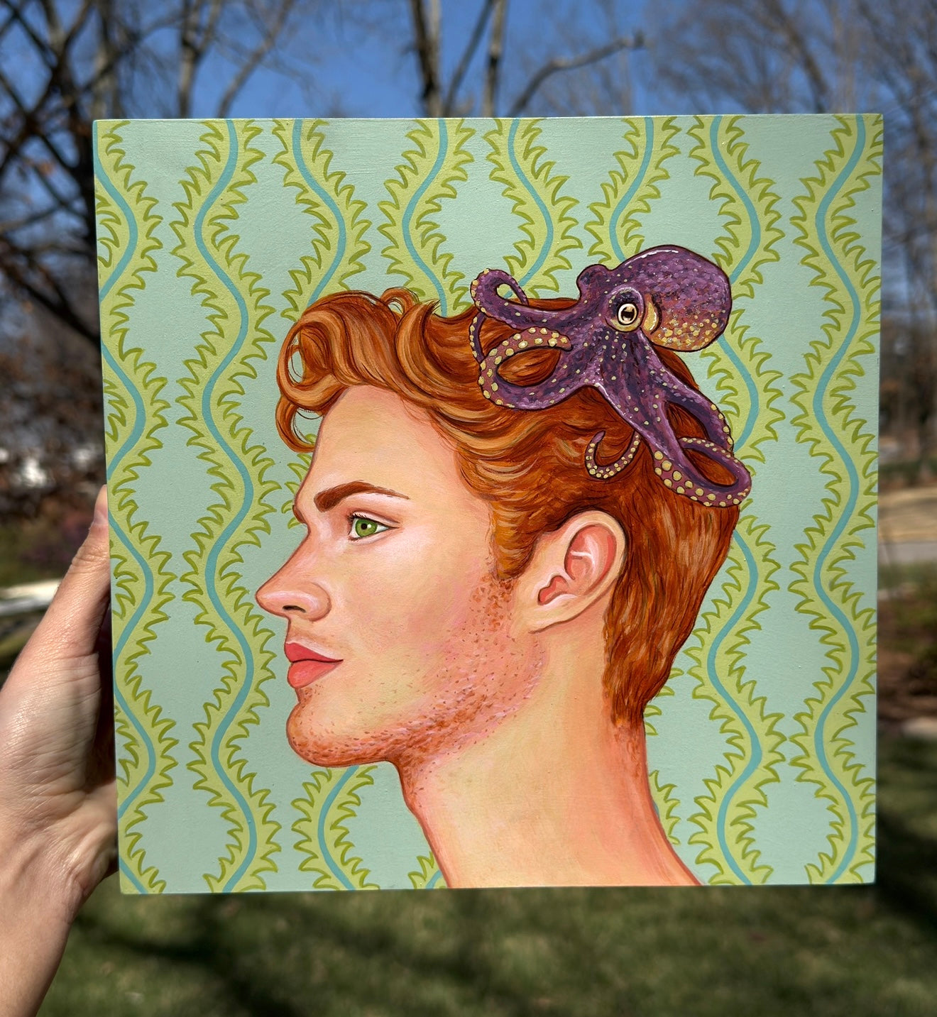 10x10x1.5 inch Acrylic painting on cradled wooden board with matte varnish.