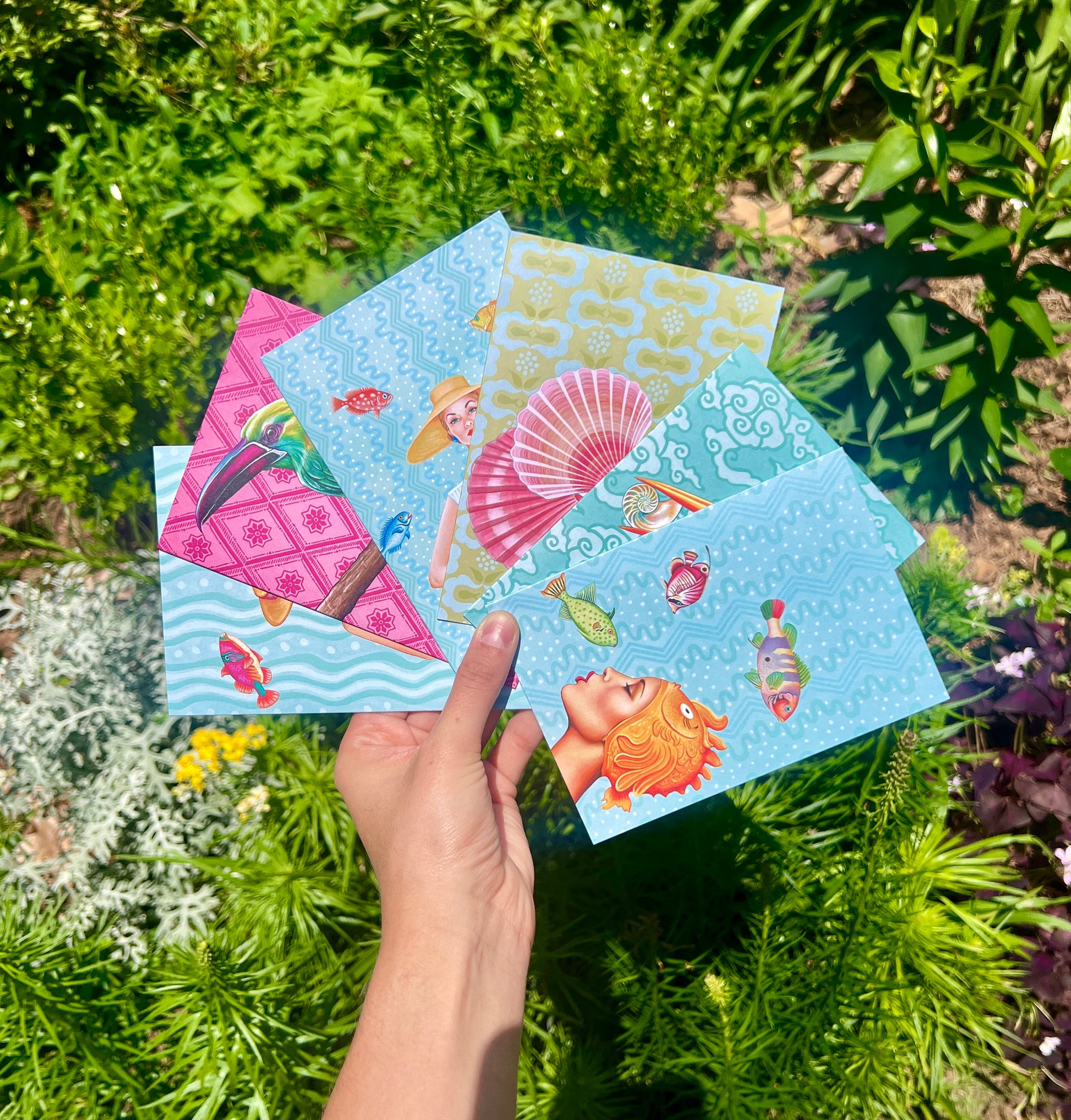 Each card featuring a different one of Ashton Huffstetler’s colorful patterned, bird paintings or Très Chic ladies.