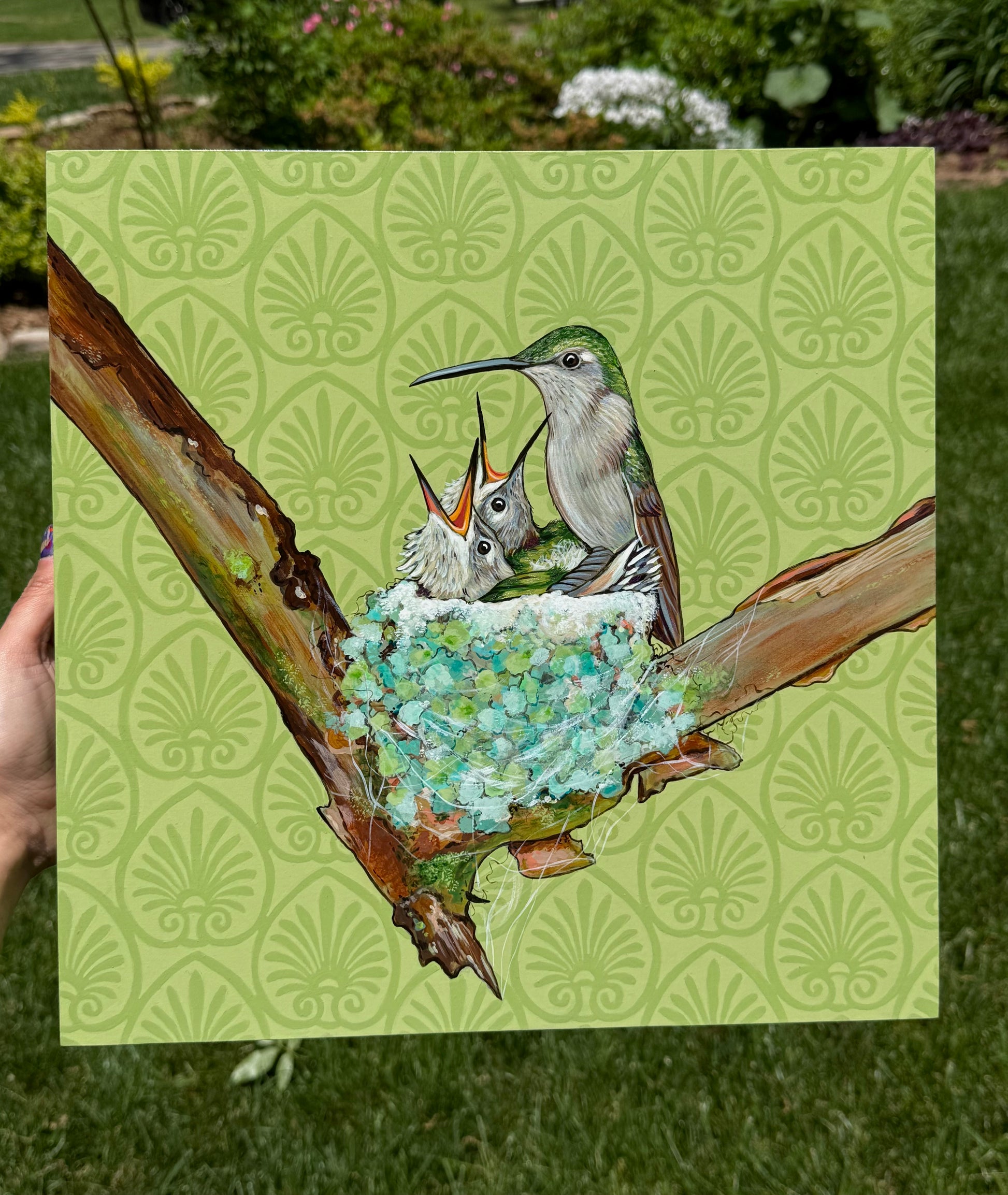 14x14x1.5 inch Acrylic paint on cradled wooden board.